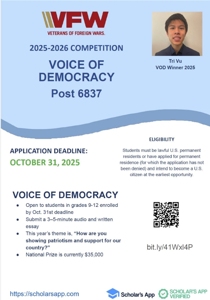 Established in 1947, the Voice of Democracy audio-essay program offers high school students a unique platform to express their views on democratic and patriotic themes β through their own voice.